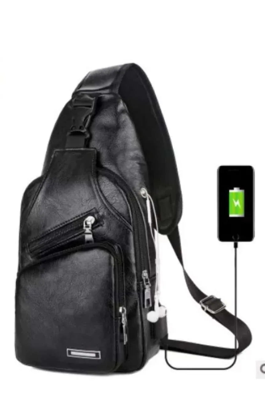 Men’s PU Leather Chest Bag – Casual Solid Color USB Charging Crossbody Bag